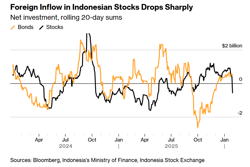 Context: Last week, Indonesia’s stock index fell over 6% as MSCI downgraded the country’s equities leading the CEO of the exchange to resign. Markets rebounded slightly after the country’s SWF “Danantara” announced they would continue to buy Indonesian stocks to stimulate growth.